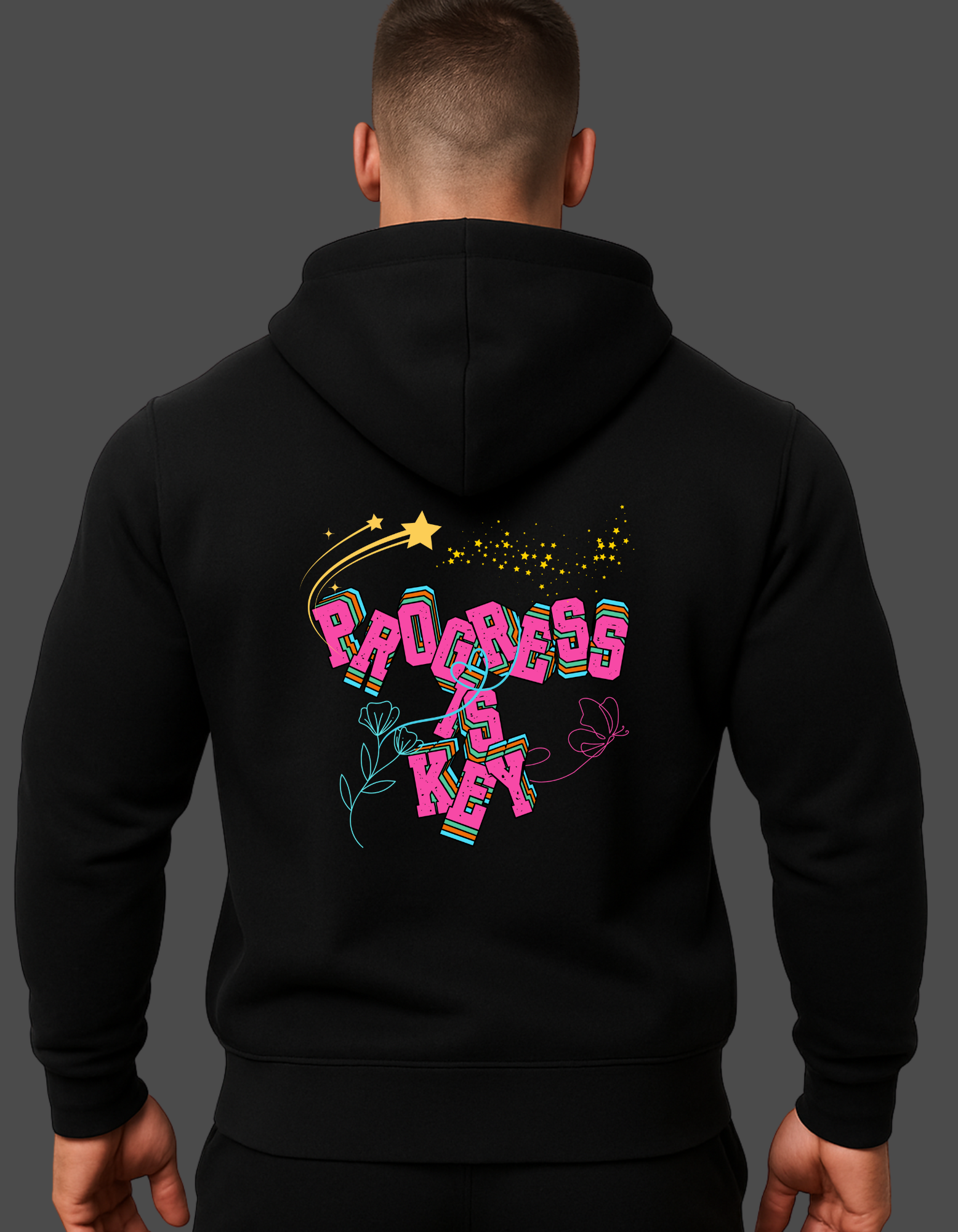 Stylischer schwarzer Hoodie mit farbenfrohem “Progress Is Key” Rückenprint – bequem, hochwertig und motivierend für Alltag und Training.